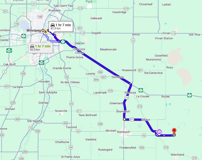 When coming from Winnipeg we recommend using the preferred route posted below which will keep you on paved HWY until the last 3km.